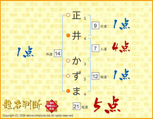 生活面を象徴する運勢です。外部から受ける影響力を表し、結婚運、家庭運や職場、環境への順応性を表します。総運から人運を引いた画数。姓や名が1文字の場合を除く。