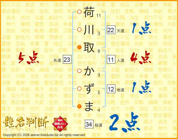 荷川取かずまさんの総運は34画の2点!