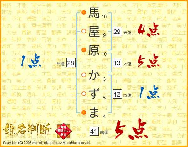 馬(10画)屋(9画)原(10画) か(3画)ず(5画)ま(4画)