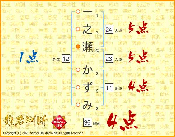 一(1画)之(3画)瀬(20画) か(3画)ず(5画)み(3画)