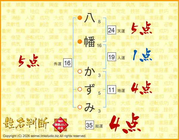 八(8画)幡(16画) か(3画)ず(5画)み(3画)