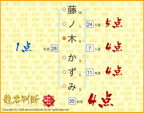 藤(19画)ノ(1画)木(4画) か(3画)ず(5画)み(3画)