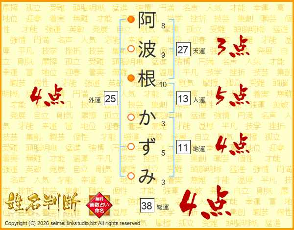 阿(8画)波(9画)根(10画) か(3画)ず(5画)み(3画)
