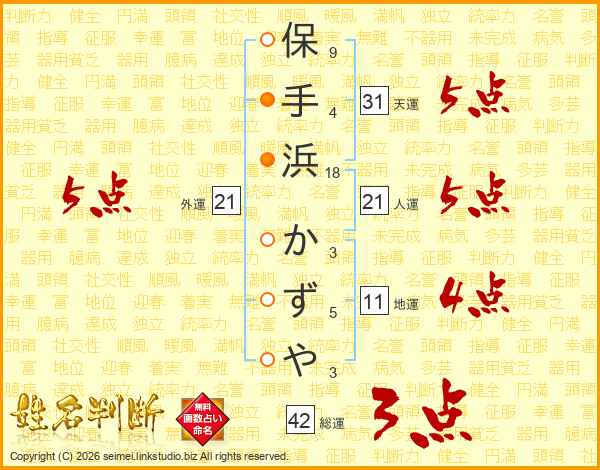 保(9画)手(4画)浜(18画) か(3画)ず(5画)や(3画)