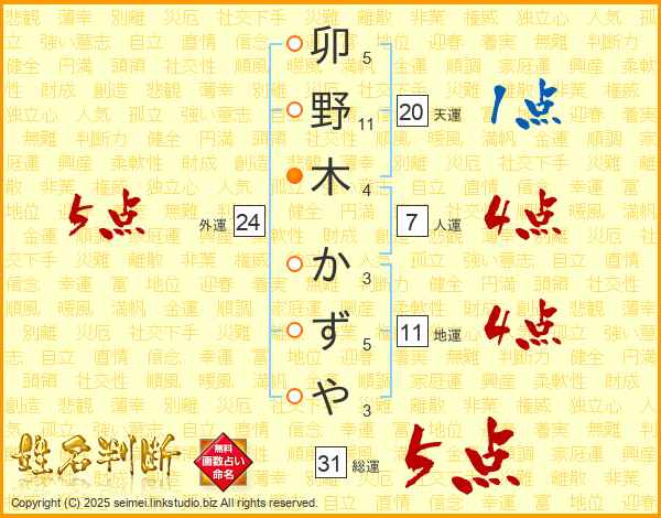卯野木かずやさんの総運は31画の5点!