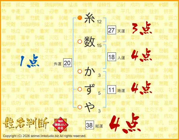 糸(12画)数(15画) か(3画)ず(5画)や(3画)