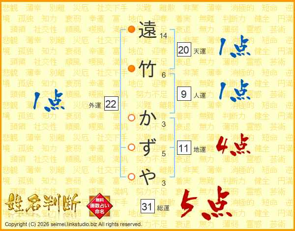 遠竹かずやさんの総運は31画の5点!
