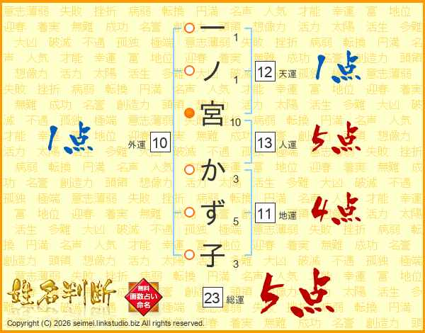 一(1画)ノ(1画)宮(10画) か(3画)ず(5画)子(3画)