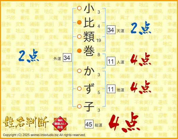 小(3画)比(4画)類(19画)巻(8画) か(3画)ず(5画)子(3画)