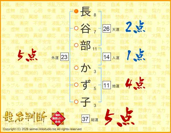 長(8画)谷(7画)部(11画) か(3画)ず(5画)子(3画)