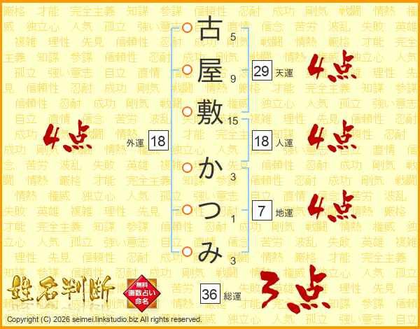 古(5画)屋(9画)敷(15画) か(3画)つ(1画)み(3画)