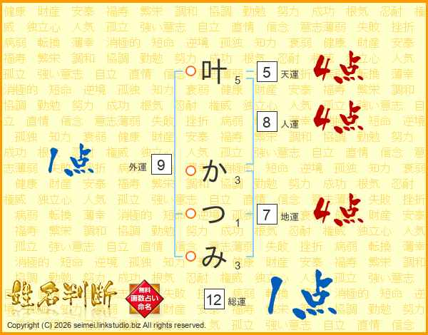 生活面を象徴する運勢です。外部から受ける影響力を表し、結婚運、家庭運や職場、環境への順応性を表します。総運から人運を引いた画数。姓や名が1文字の場合を除く。