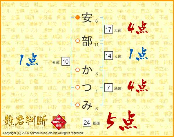 安部かつみさんの総運は24画の5点!
