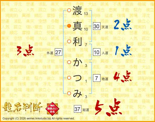 渡(13画)真(10画)利(7画) か(3画)つ(1画)み(3画)