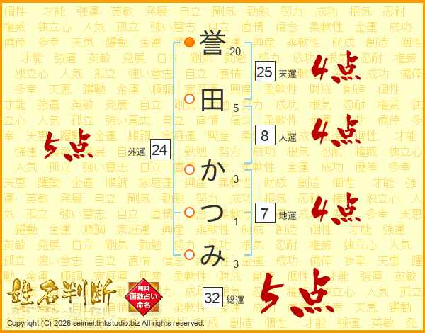 誉(20画)田(5画) か(3画)つ(1画)み(3画)