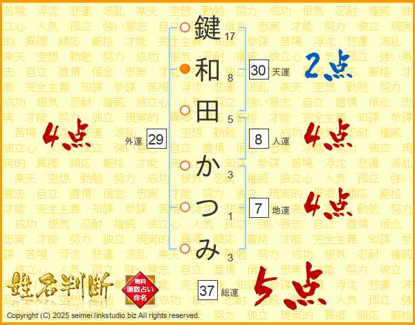 鍵和田かつみさんの総運は37画の5点!