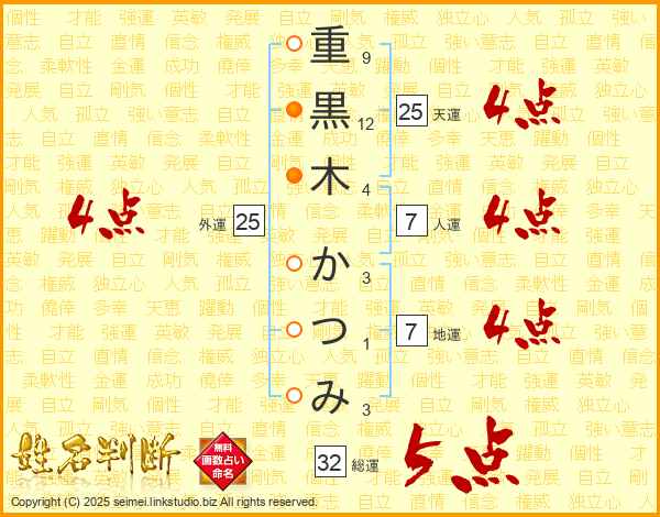 重(9画)黒(12画)木(4画) か(3画)つ(1画)み(3画)