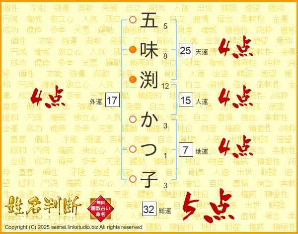 五(5画)味(8画)渕(12画) か(3画)つ(1画)子(3画)