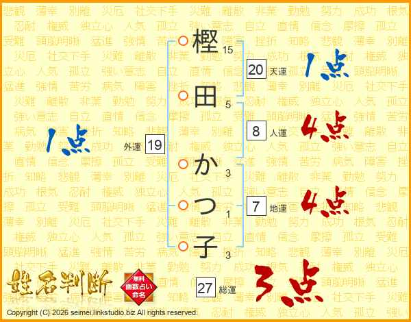 生活面を象徴する運勢です。外部から受ける影響力を表し、結婚運、家庭運や職場、環境への順応性を表します。総運から人運を引いた画数。姓や名が1文字の場合を除く。