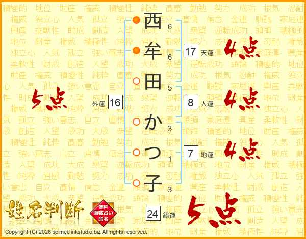 西(6画)牟(6画)田(5画) か(3画)つ(1画)子(3画)