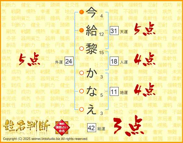 今(4画)給(12画)黎(15画) か(3画)な(5画)え(3画)