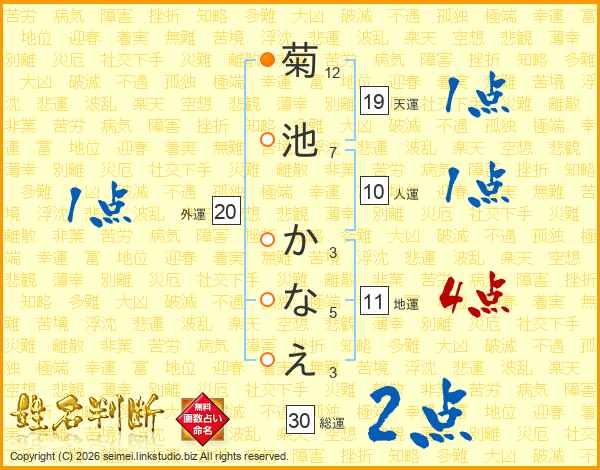 菊(12画)池(7画) か(3画)な(5画)え(3画)
