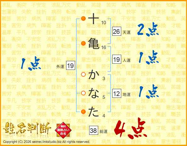 十(10画)亀(16画) か(3画)な(5画)た(4画)