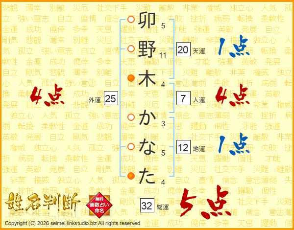 卯野木かなたさんの総運は32画の5点!