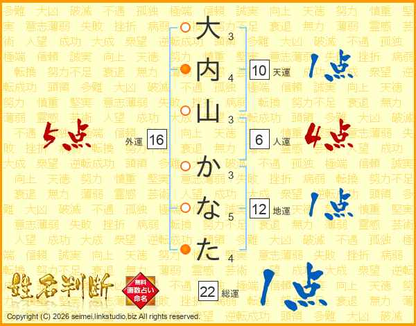 大(3画)内(4画)山(3画) か(3画)な(5画)た(4画)