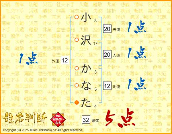生活面を象徴する運勢です。外部から受ける影響力を表し、結婚運、家庭運や職場、環境への順応性を表します。総運から人運を引いた画数。姓や名が1文字の場合を除く。