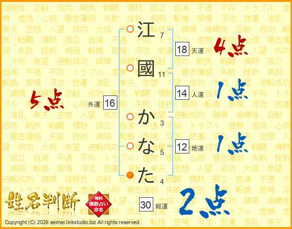 江(7画)國(11画) か(3画)な(5画)た(4画)