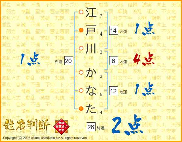 生活面を象徴する運勢です。外部から受ける影響力を表し、結婚運、家庭運や職場、環境への順応性を表します。総運から人運を引いた画数。姓や名が1文字の場合を除く。