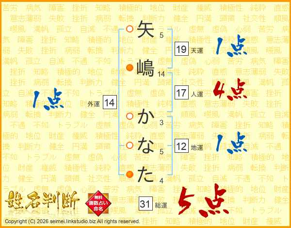 矢嶋かなたさんの総運は31画の5点!