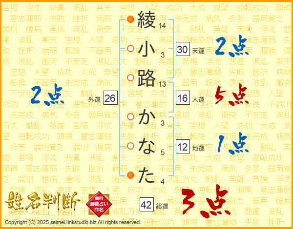 綾(14画)小(3画)路(13画)  か(3画)な(5画)た(4画)