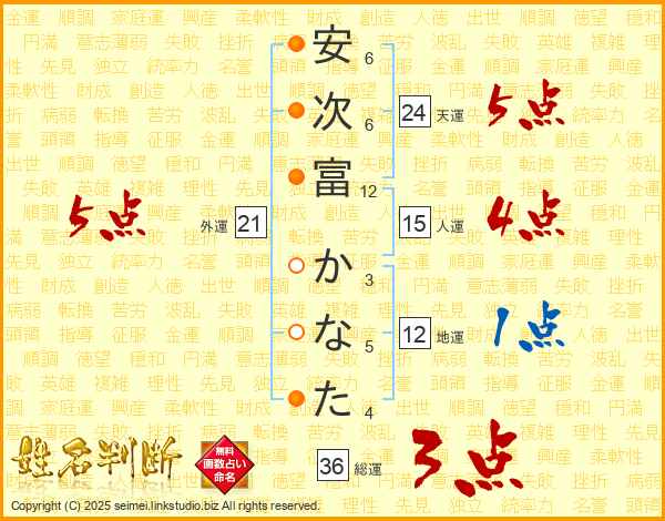 安(6画)次(6画)富(12画) か(3画)な(5画)た(4画)