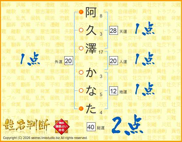 阿久澤かなたさんの人運は20画の1点!