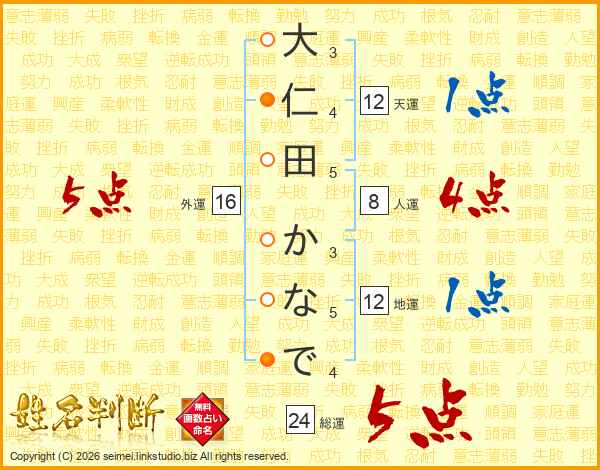 大(3画)仁(4画)田(5画) か(3画)な(5画)で(4画)
