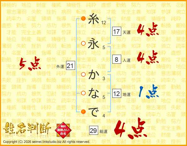 糸(12画)永(5画) か(3画)な(5画)で(4画)