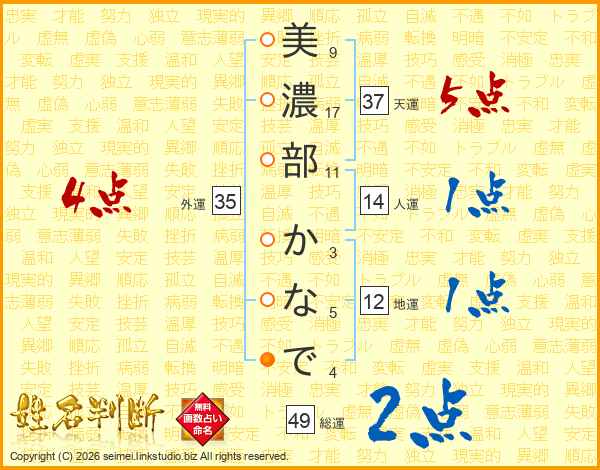 美(9画)濃(17画)部(11画) か(3画)な(5画)で(4画)