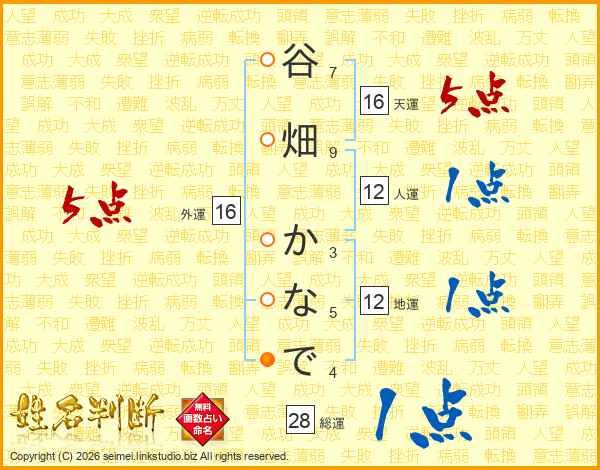 谷畑かなでさんの外運は16画の5点!