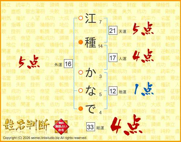 江(7画)種(14画) か(3画)な(5画)で(4画)