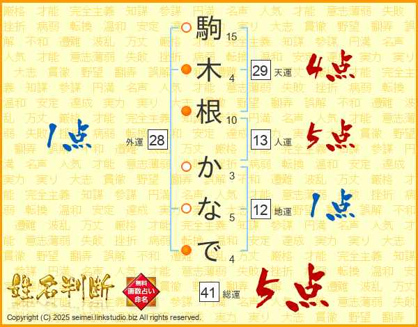 駒(15画)木(4画)根(10画) か(3画)な(5画)で(4画)