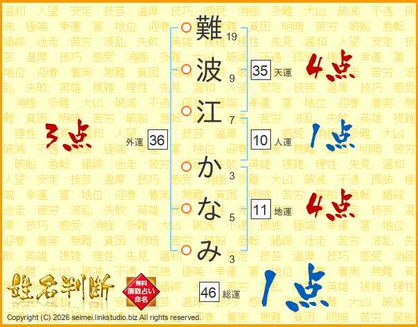 難(19画)波(9画)江(7画) か(3画)な(5画)み(3画)