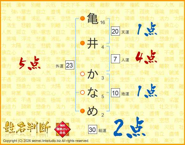亀(16画)井(4画) か(3画)な(5画)め(2画)