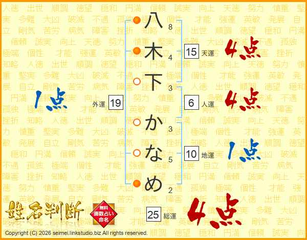 八(8画)木(4画)下(3画) か(3画)な(5画)め(2画)