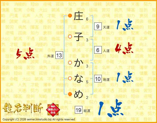 庄(6画)子(3画) か(3画)な(5画)め(2画)