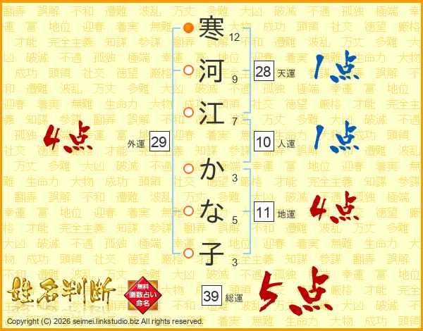 寒(12画)河(9画)江(7画) か(3画)な(5画)子(3画)