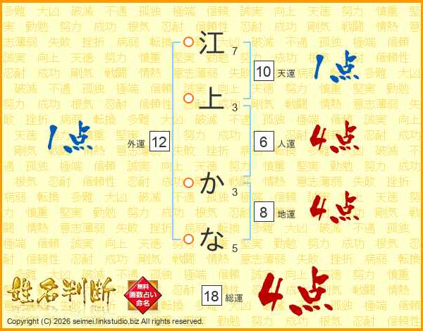 生活面を象徴する運勢です。外部から受ける影響力を表し、結婚運、家庭運や職場、環境への順応性を表します。総運から人運を引いた画数。姓や名が1文字の場合を除く。
