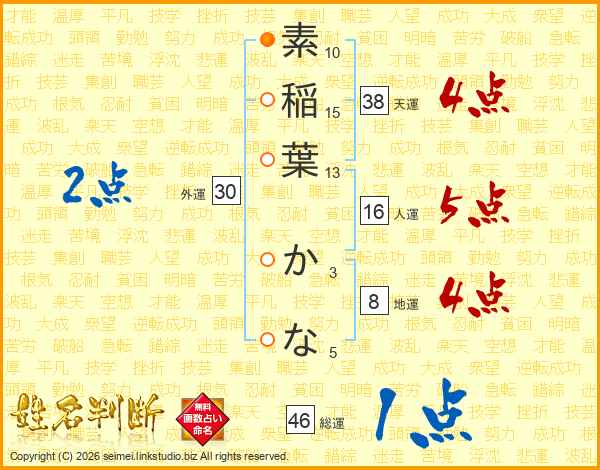 素(10画)稲(15画)葉(13画) か(3画)な(5画)