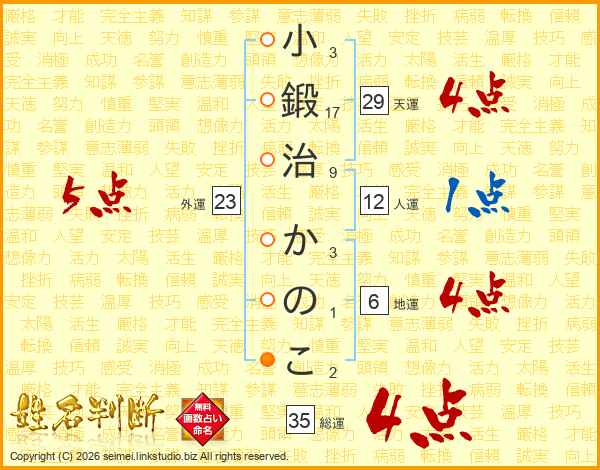 小(3画)鍛(17画)治(9画) か(3画)の(1画)こ(2画)